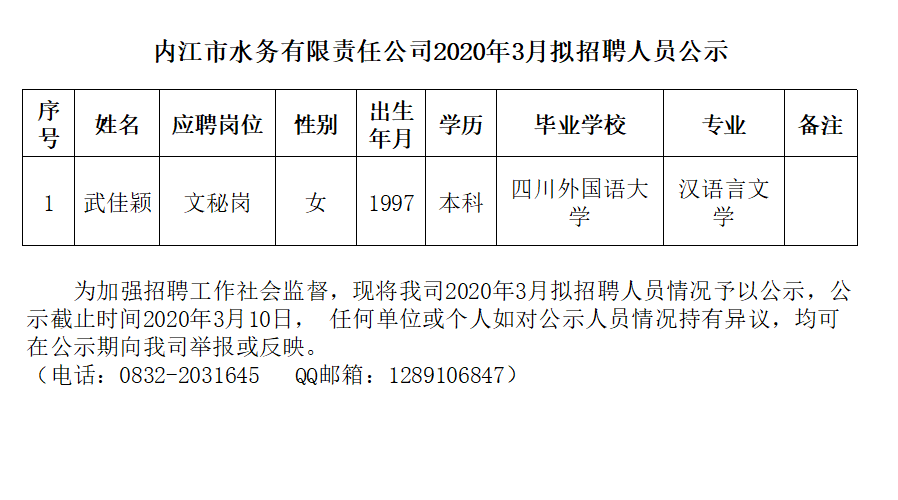 內(nèi)江市水務有限責任公司2020年3月擬招聘人員公示