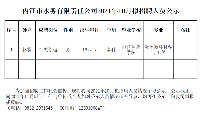 內江市水務有限責任公司2021年10月擬招聘人員公示