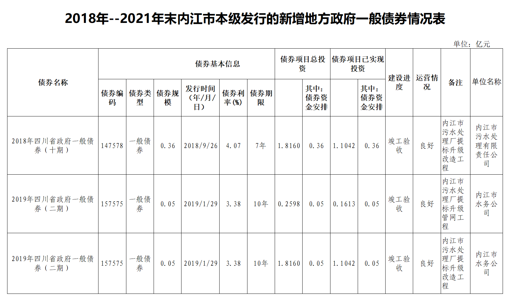 2018年--2021年末內江市本級發(fā)行的新增地方政府一般債券情況表