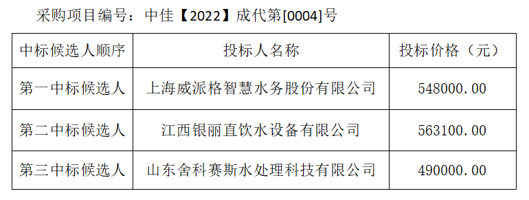 內江市水務有限責任公司東湖御景小區集中式管道直飲水成套設備及附件采購(含安裝)項目評標結果公示