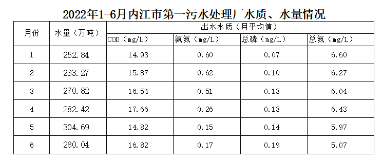 內(nèi)江市污水處理有限責(zé)任公司第一污水處理廠2022年1-6月水量、水質(zhì)情況