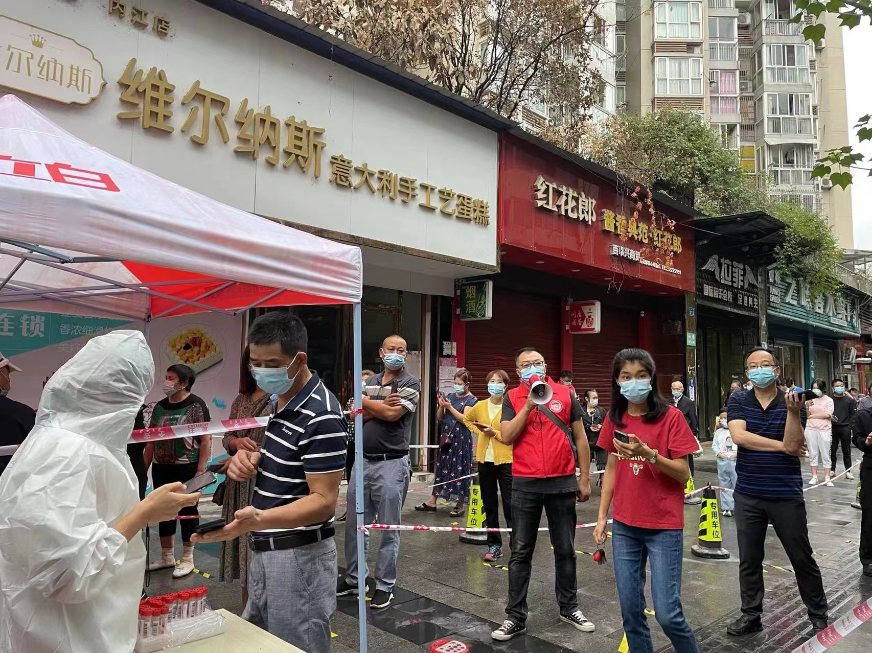 居住在市中區的兩名黨員袁弋涵和饒一與支部對口幫扶的甘泉寺社區對接后,在梅家山體育場核酸采集點參與志愿服務工作;居住在東興區的兩名黨員倪勇、鄧倩到就近社區(月兒灣社區、萬達社區)“雙報道”,聽從社區的統一安排開展志愿服務。