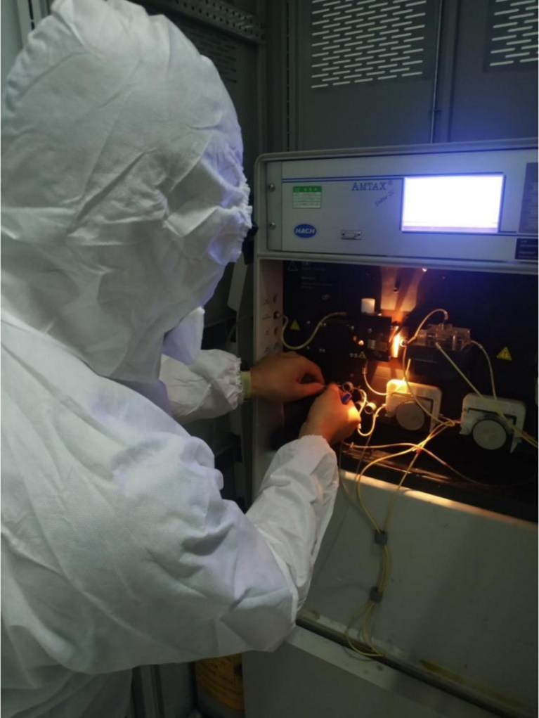 9月11日8時左右,出水氨氮在線監測儀器顯示異常,駐廠人員蘇洋、廖劍鋒及時通過視頻連線的方法聯系在線設備維護單位相關技術人員,通過反復拆裝電子元器件、清洗過程管路、調節發光源等方式查找原因。經過近9個小時的問題排查,駐廠人員發現是因為檢測器光源異常,造成監測數據異常,非正常水質情況反映,于是立即對該元器件進行檢修調整,在18點左右出水氨氮在線儀器恢復正常運行。