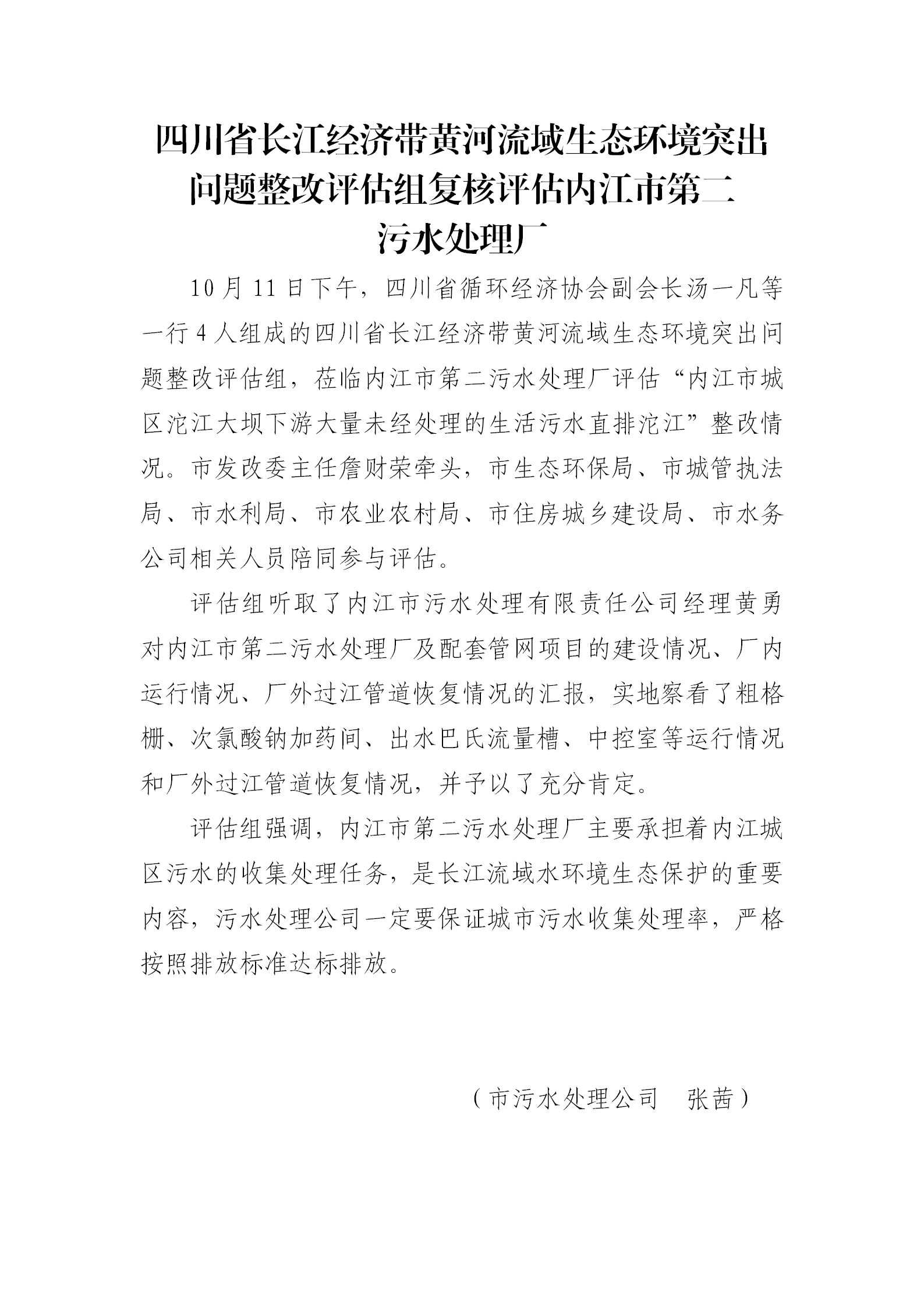 四川省長江經(jīng)濟帶黃河流域生態(tài)環(huán)境突出問題整改評估組復核評估內江市第二 污水處理廠