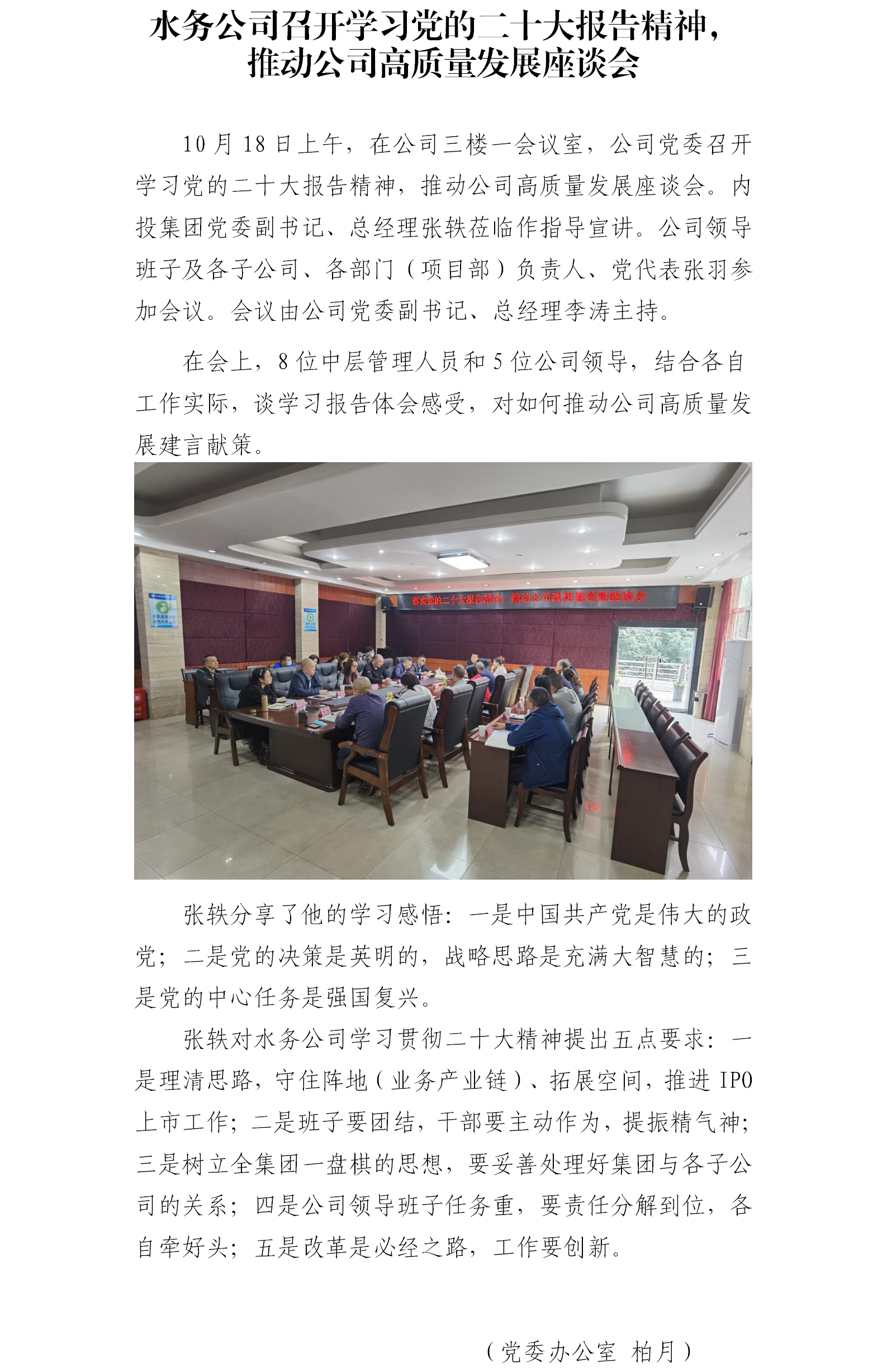 水務公司召開學習黨的二十大報告精神, 推動公司高質量發展座談會