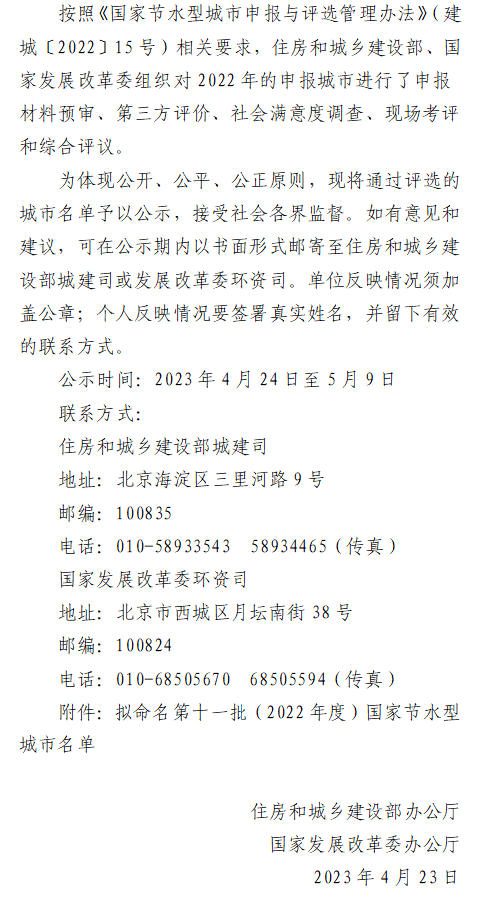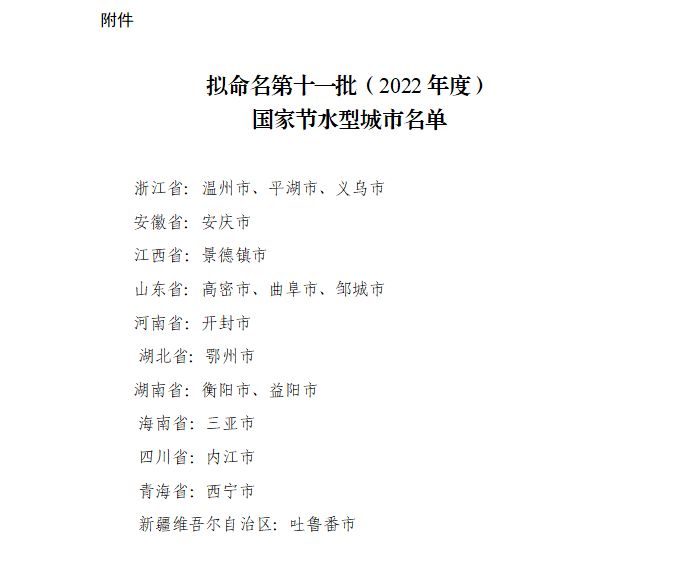 關于擬命名第十一批(2022年度) 國家節水型城市的公示