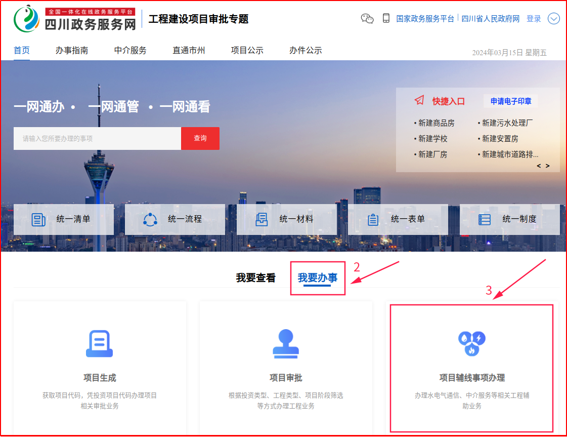 (一)網上申請:申請人登錄四川政務服務網平臺,點擊工程建設項目審批專欄,選擇具體報裝辦理事項,提交申請,上傳申請材料。